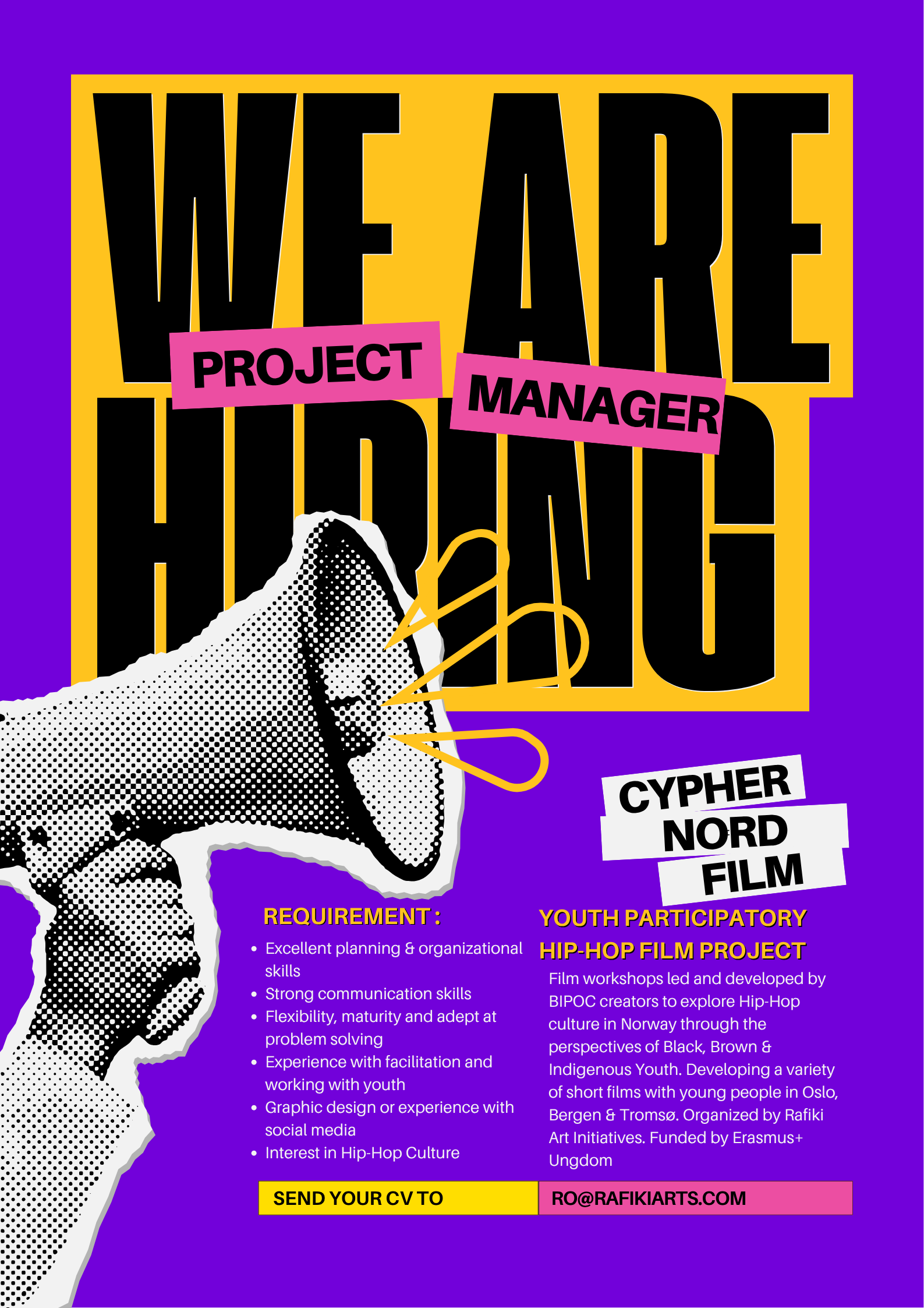 With generous support from Bufdir and Erasmus+ grant funding, CYPHER NORD will take participants ages 13-20 in Oslo, Bergen, and Tromsø through the filmmaking process to develop their own short film about Hip-Hop which they will exhibit as part of the project. They will be a part of an eventual larger film project that captures the process and collages the shorts to make visible a potent and expressive image of what Hip-Hop means to youth in Norway. Additionally, we hope to connect with Hip-Hop artists that the youth will be able to engage with and learn from.